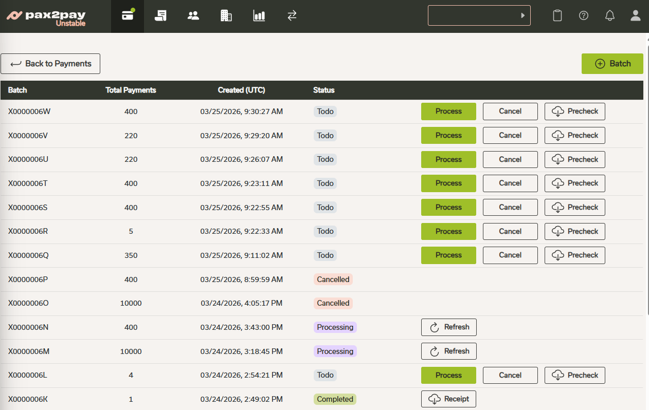 - Batch Summary: After submitting the batch payment CSV template, you can view a detailed overview including pre-upload checks, real-time status updates, and download confirmations.